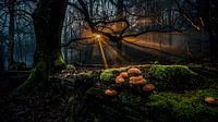 Oud bos met zonlicht door de bomen aan het einde van de dag met op de voorgrond wat paddestoelen en mos.