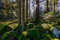 Bomen in het bos op de langeafstandswandelroute Westweg bij Kaltenbronn in het Zwarte Woud, Baden-Württemberg, Duitsland