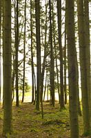 Te zien zijn: Bomen. Bos en veel licht in een retro look.