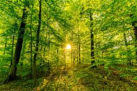 Bos met beukenbomen en groene bladeren met zonnestralen tegen het licht