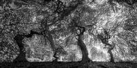 Koop dit abstracte kunstwerk Bos met oude bomen onder een gloeiend bladerdak in zwart-wit van Manfred Voss, Zwart-Wit Fotografie op canvas, aluminium dibond, (ingelijste) fotoprint, behang en ArtFrame, op maat geprint in Fine-Art kwaliteit.