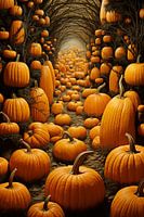 Sprookjesachtige illustratie van een bos met pompoenen, de blik wordt naar achter de diepte in geleid.