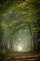Foto van een boslaantje, in de mist. het lijkt wel een soort tunnel. En je kijkt naar het licht. Het is vroeg in de ochtend. Het was mistig. De zon komt op en schijnt tussen de bomen door, waardoor je mooie zonneharpen krijgt te zien. De bomen hebben nog bladeren, het is aan het begin van de herfst. De foto is genomen op Landgoed de Vossenberg, bij Wijster in Drenthe (Nederland).