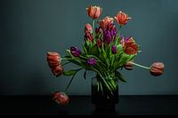 De achtergrond is een effen donkere grijstint, die de heldere en levendige kleuren van de tulpen benadrukt. Het licht valt subtiel op de bloemen, waardoor hun delicate textuur en levendige kleuren goed tot hun recht komen. Het geheel straalt frisheid, elegantie en eenvoud uit—een betoverend arrangement dat de schoonheid van de natuur perfect vastlegt.