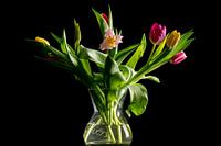 Stilleven van een bos tulpen op vaas. Minimalistische impressie van tulpen in een doorzichtige vaas.