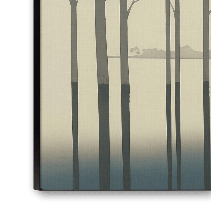 De minimalistische benadering van het landschap, met de nadruk op verticale lijnen en de afwezigheid van gedetailleerde texturen, geeft het werk een moderne, bijna grafische kwaliteit. Dit wordt verder benadrukt door de zachte nevel die de basis van de bomen omhult, waardoor de grenzen tussen water en land vervagen en een droomachtige sfeer ontstaat.