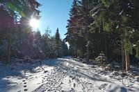 Winterlandschap in het bos, met lensflare, sneeuw en een spoor.