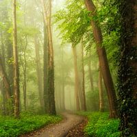Kronkelpad door een mistig bos. Lochem, Gelderland
