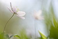 Als de zon schijnt staan de witte bloempjes van de Bosanemoon prachtig open, gericht naar het licht, waardoor je de mooie meeldraden kan bewonderen. Ze staan hier temidden van het frisse blad van de Lelietjes van dalen.