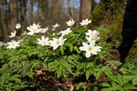 Close-up van bloeiende bosanemonen vanuit een lage hoek (Anemone nemorosa), voorbodes van het voorjaar in de uiterwaarden van Dhünn in het Bergisches Land, Duitsland