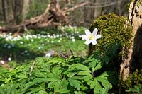 Close-up van bloeiende bosanemonen vanuit een lage hoek (Anemone nemorosa), voorbodes van het voorjaar in de uiterwaarden van Dhünn in het Bergisches Land, Duitsland