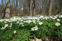 Close-up van bloeiende bosanemonen vanuit een lage hoek (Anemone nemorosa), voorbodes van het voorjaar in de uiterwaarden van Dhünn in het Bergisches Land, Duitsland