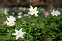 Close-up van bloeiende bosanemonen vanuit een lage hoek (Anemone nemorosa), voorbodes van het voorjaar in de uiterwaarden van Dhünn in het Bergisches Land, Duitsland