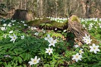 Close-up van bloeiende bosanemonen vanuit een lage hoek (Anemone nemorosa), voorbodes van het voorjaar in de uiterwaarden van Dhünn in het Bergisches Land, Duitsland