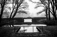 Een mistige middag bij de Bosbaan levert interessante plaatjes op. Zoals deze auto over de brug.