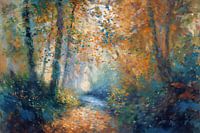 Een dromerig impressionistisch schilderij van een mysterieus bospad in herfstkleuren. De combinatie van warme oranje en gouden tinten met koele blauwen creëert een betoverende sfeer. Een bosbeekje omzoomd door hoge bomen, verdwijnt in een mistige verte terwijl herfstbladeren dwarrelen in het diffuse licht dat door de boomkruinen valt.