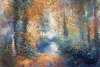 Een betoverend impressionistisch landschap waar warme herfsttinten en koele blauwtonen elkaar ontmoeten in een mysterieus bospad. De zachte, dromerige penseelstreken creëren een bijna mistige atmosfeer, terwijl gouden bladeren lijken te dansen in het diffuse licht. Een bosbeekje kronkelt elegant door het beeld en nodigt de kijker uit om…