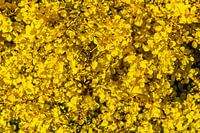 De foto toont een dicht gebied met kleine, gele bladeren van de berberis, die het hele beeldvlak gelijkmatig bedekken. De bladeren zijn ovaal tot licht lancetvormig en staan dicht op elkaar, waardoor een levendig, bijna textielachtig patroon ontstaat. De intense gele kleur geeft het schilderij een heldere, lichtgevende uitstraling.