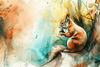 De afbeelding toont een levendige scène in een bosrijk landschap, waar een eekhoorn op de voorgrond staat. Zijn pluizige vacht straalt een kleurrijk palet uit, alsof hij rechtstreeks uit een aquarelschilderij is gesprongen. De eekhoorn houdt een eikeltje vast tussen zijn voorpoten, zijn ogen schitteren met een onderliggende boosheid, die contrasteert met het vredige zomerse gevoel dat het bos omringt. De bomen achter de eekhoorn zijn gehuld in een weelderig groen bladerdak, badend in het warme zonlicht dat door de bladeren filtert. Het geheel creëert een sfeer van zorgeloze dagen in de zomer, maar de spanning in de houding van de eekhoorn suggereert een diepere emotionele complexiteit, waardoor de kijker wordt uitgenodigd om verder te kijken dan het oppervlak van het idyllische tafereel.