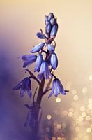 Paarsblauwe boshyacinten gefotografeerd in het Hallerbos in Belgie tijdens een prachtige zonsopkomst met een sprankelende lichtval in de achtergrond wat een fraai bokeh mee geeft in de foto.