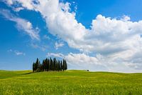 Het kleine bosje cipressen van Torrenieri in de glooiende heuvels met gele bloemen en gras in de buurt van San Quirico d'Orcia in Val d'Orcia onder een blauwe hemel met prachtige witte wolken op een mooie lentedag in Toscane, Italië.