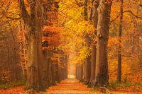 Idyllische foto van een boslaan in Beetsterzwaag, met een uitnodigend bospad dat geflankeerd wordt door majestueuze bomen in warme oranje herfsttinten. Het pad wordt omlijst door een klein, rustiek hekje aan de voorzijde, wat een intiem en schilderachtig element toevoegt aan de compositie. De diepte van het pad trekt de blik naar binnen en nodigt uit tot een wandeling door dit serene Friese landschap. De rijke herfstkleuren en de natuurlijke symmetrie van de bomen maken deze foto tot een tijdloos kunstwerk, perfect voor liefhebbers van natuur en seizoensgebonden schoonheid.