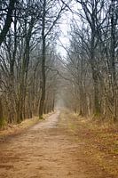Het bos in de Achterhoek, Kotten gemeente Winterswijk is een van de mooiste plekjes van Nederland. Nu vroeg in het voorjaar is het nog een beetje kaal zonder blad aan de bomen en een beetje mistig weer. Het heeft prachtige paden en lanen om te wandelen en te fietsen.