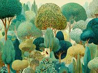 Boslandschap | Calm Forest Escape - Dit is een abstract schilderij met een weelderig boslandschap vol ronde, kleurrijke bomen in verschillende tinten groen en geel, die een gevoel van rust en verbondenheid met de natuur oproepen.