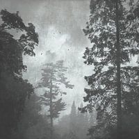 Een mistig boslandschap met hoge bomen tegen een mistige lucht. De grijstinten onderstrepen de sfeervolle stemming van het landschap.
