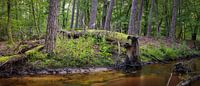 Deze sfeervolle foto toont een idyllisch boslandschap waarin een omgevallen boom over een rustige beek ligt. Het tafereel straalt een gevoel van natuurlijke rust en balans uit, terwijl het verhaal van de natuurcyclus subtiel wordt verteld. De boom, die ooit fier overeind stond, dient nu als brug en decor, terwijl de beek vredig langs de wortels en stam stroomt.