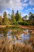 Een mooi boslandschap bij een laagstaande zon met tegen de blauwe lucht afstekende wolken, met in de voorgrond de reflectie in een deels met riet begroeid ven op de Noordwest Veluwe.