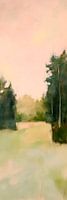 Een rustig landschap ontvouwt zich in zachte pastelkleuren, waarin glooiende heuvels en slanke bomen harmonieus op elkaar inwerken. De lucht schijnt in een zacht licht, terwijl het pad je uitnodigt naar een onbestemde bestemming. Dit sfeervolle landschap straalt een vredige melancholie uit en een verlangen naar een verborgen paradijs.