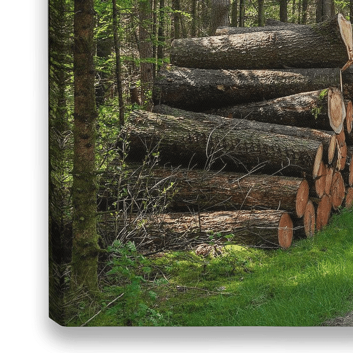 Gekapte boomstammen liggen opgestapeld langs een recht zandpad, de scheidslijn tussen naaldbos en loofbos percelen in het bos van boswachterij Drouwen en Borger op een zonnige Lente middag in April 2024. Deze foto is gemaakt met een Fujifilm X series camera.