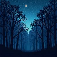 Een serene en licht mysterieuze scène ontvouwt zich in dit digitale kunstwerk, dat een pad voorstelt dat zich 's nachts door een dichtbegroeid bos slingert. Silhouetten van bladerloze bomen reiken naar een diepblauwe, met sterren bezaaide hemel, waar een maansikkel een zachte gloed werpt. Het pad voor ons vervaagt in een mistige verte en nodigt de kijker uit's verbeelding te laten dwalen in de stille duisternis. De koele tinten en grimmige silhouetten creëren een vredige en toch enigszins raadselachtige sfeer.