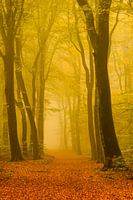 Leeg bospad omringd door grillige Beukenbomen tijdens een mistige sfeervolle herfst ochtend. Dit bospad ligt in het Speulderbos op de Veluwe nabij Drie.