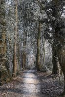 Slingerend bospad in een winters landschap met mooie witte bomen en een ijzig geheel