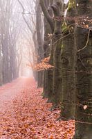 Natuurfoto van een bospad op een mistige winter ochtend.