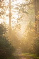Pad door een mistig bos tijdens een mooie mistige herfstdag. De bosgrond van het Speulder- en Sprielderbos in natuurgebied de Veluwe is bedekt met bruin gevallen blad en het pad verdwijnt in de verte. De mist geeft het bos een desolate sfeer.