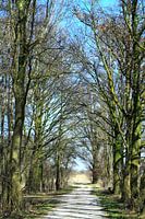 Bospad tijdens de herfst. Warme zonnestralen en schaduw van de bomen en struiken.