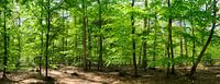 Een foto van een beukenbos in het voorjaar. De zon schijnt op de lichtgroene blaadjes van de bomen in het bos. De natuur die uitloopt in het lente is op z'n mooist als de zon erop schijnt.