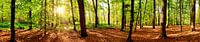 Bos in de herfst met felle zon die door de bomen schijnt. De foto is genomen in Königsforst bij Keulen op een zonnige dag in oktober. De bosbodem is bedekt met herfstbladeren. De zon laat de nog groene bladeren aan de bomen schijnen.