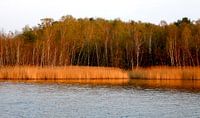 rand van het bos bij het meer in het avondlicht