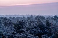 Een betoverend winterlandschap ontvouwt zich in dit beeld van een met rijp bedekte bosrand, gehuld in paarse ochtendmist. De gelaagdheid van de bomen, van scherp op de voorgrond tot vaag aan de horizon, creëert een diepte en stilte die bijna tastbaar is. De combinatie van koele blauwtinten en het zachte roze van de lucht roept een gevoel van serene afzondering op – een moment van bevroren rust voordat de dag begint. Dit werk spreekt tot liefhebbers van mystieke natuurlandschappen en minimalistische winterse rust.