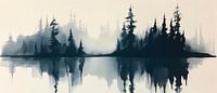 Een mystiek landschap met silhouetten van bomen die weerspiegeld worden in het heldere water ontvouwt zich in zachte grijstinten. Dit harmonieuze landschap straalt rust en sereniteit uit en nodigt uit tot dromen. Ideaal voor de slaapkamer of een leeshoek, waar het een ontspannen sfeer creëert.