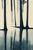Een mysterieus bos, glinsterend en mistig, geeft de kamer een kalme, meditatieve sfeer. De gestileerde bomen worden weerspiegeld in het zachte water en creëren een harmonieuze verbinding met de natuur. Perfect voor de slaapkamer om ontspannen te dromen, of voor de woonkamer om een uitnodigende en rustgevende sfeer te creëren.