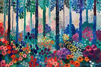 In 'Bosrijk Bloemenfestijn' stap je een woud binnen waar het bloemrijke tapijt en de staande wachters van bomen een feest voor de zintuigen creëren. De bloemen in levendige tinten van rood, oranje en paars lijken bijna te bewegen in een stille dans, verlicht door lichtvlekken die door het bladerdak breken. De koele blauwen en groenen…