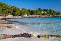 Bosrijk strandgedeelte bij Cala Agulla met turquoise water en blauwe lucht