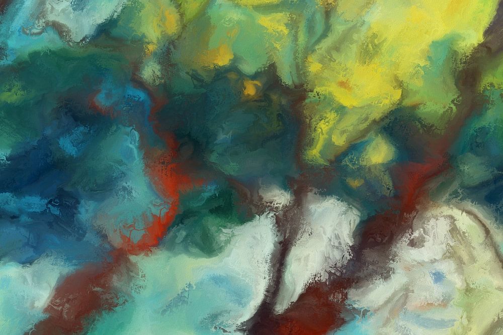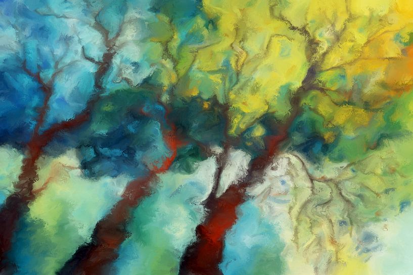 Dit schilderij, dat zich subtiel beweegt tussen abstractie en landschap, doet eerder denken aan een herinnering aan bomen dan aan een letterlijk uitzicht. Vloeiende vlakken van turkoois, mosgroen en zonovergoten geel vloeien in elkaar over, terwijl dieprode takken zich door de compositie heen uitstrekken. Er heerst een gevoel van…