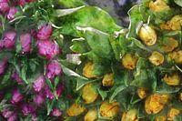Digitaal aquarel van 2 bossen tulpen. Geel en Roze.