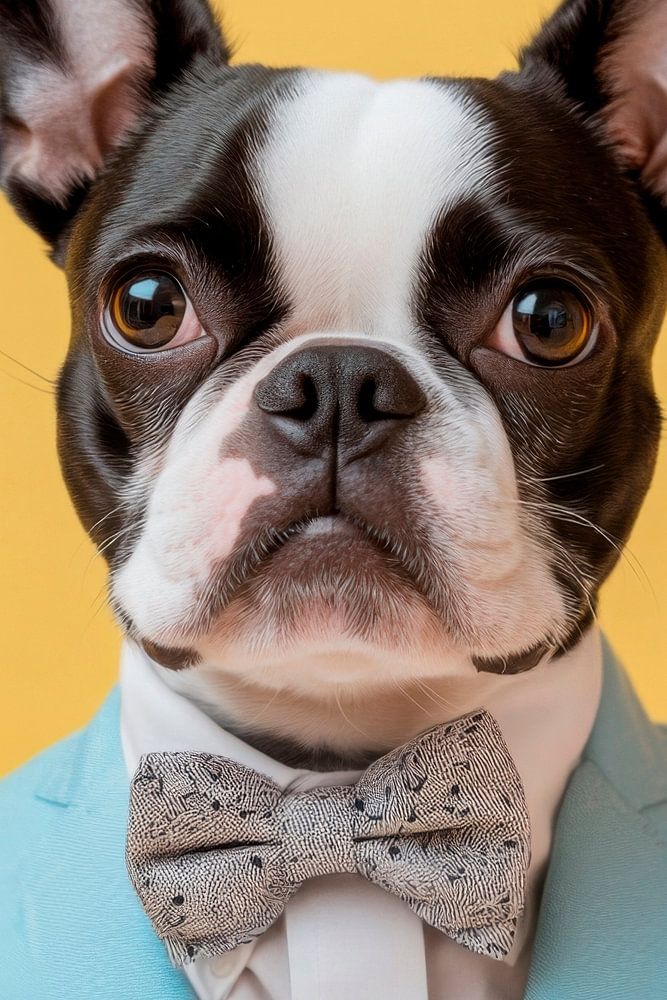 Met een charmant trouwpak en een elegante strik valt deze Boston Terrier op met zijn grote, alerte ogen en karakteristieke snuit. Tegen een felgele achtergrond straalt hij letterlijk stijl en persoonlijkheid uit - een echte fashionista onder de viervoeters!